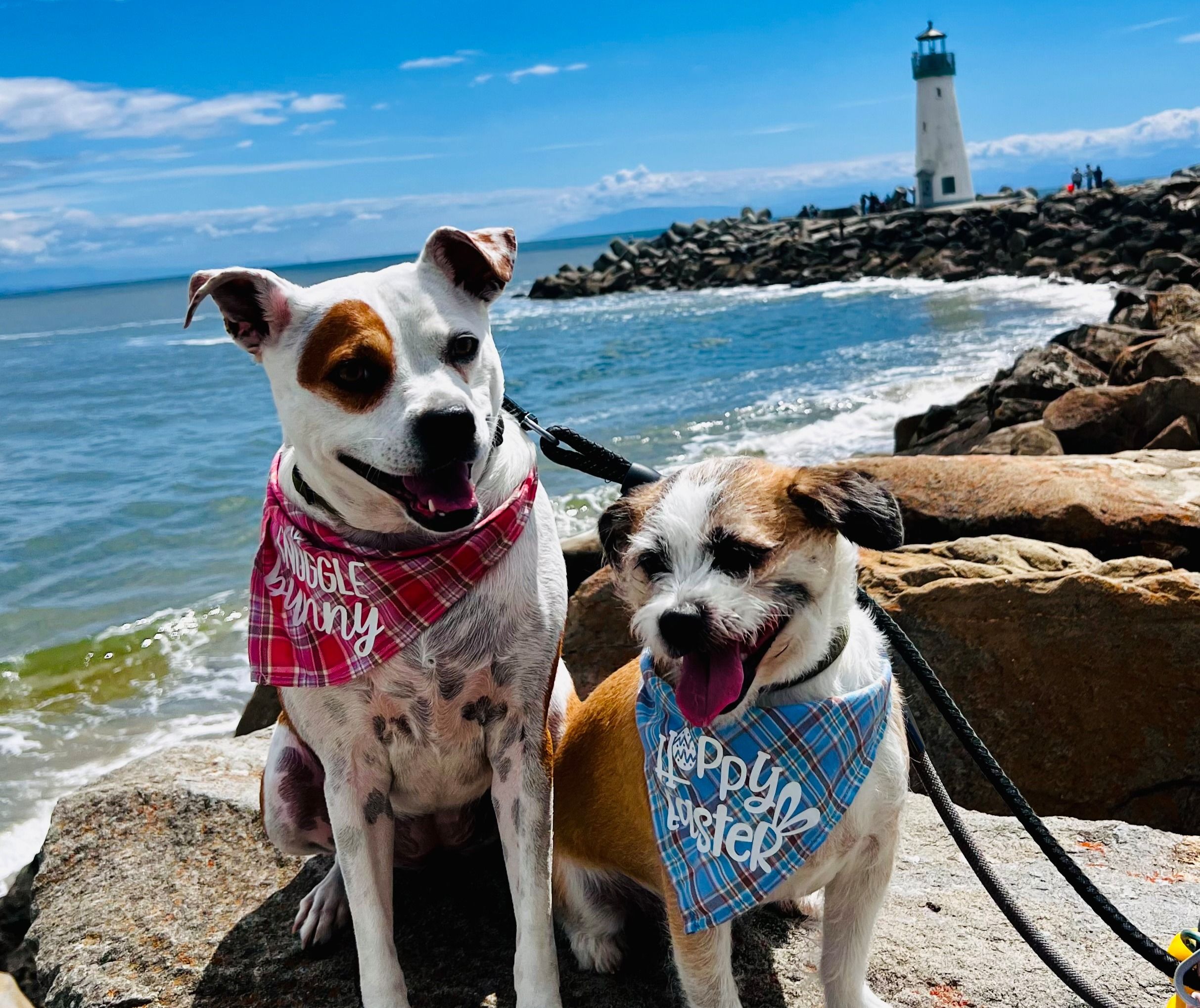 Meet Shoshanna and Bailey, two adorable pups living their best life by the ocean. These two sweethearts are all smiles, especially when they're out and about rocking their cute bandanas.
