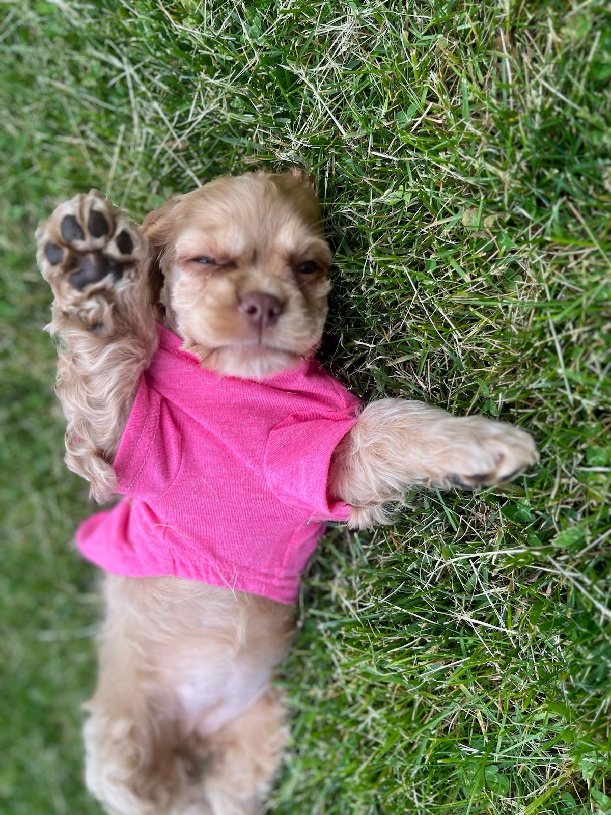 Meet today’s dog of the day! She’s the ultimate grass-rolling, sunshine-soaking puppy. She’s serving side-eye and sass in her pink tee, and honestly, she knows exactly how cute she is.